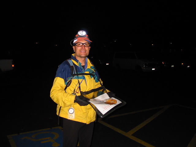 Hello- here are the results of the club's second night-O which proved very popular with people eager to get started. I was glad to see that many orienteers actually found the meet despite our attempts to hide by changing the venue and time. Kids enjoyed the glow bracelets that we adorned them with so we could keep track of them in the dark. I was amazed at how quickly people finished the courses, these are very fast times! Hey guys- you're not supposed to be running that fast at night! The intermediate course, which had many takers this time, stayed mostly in the cultivated park area with one control that was out a little in the rough. Not surprisingly, that turned out to be the control that a few people had trouble with. Greg beat out Masha for first on that course with three groups enjoying the night and coming in a little later. The advanced course had three controls in the rocky, brushy hillside, and all participant's times were very competitive and closely spaced. Blood was spilled, but thankfully no major injuries. Andy went out on the beginner course complete with Elijah and young, maybe 3? year old daughter Rosie, who did the course on foot with her own flashlight.